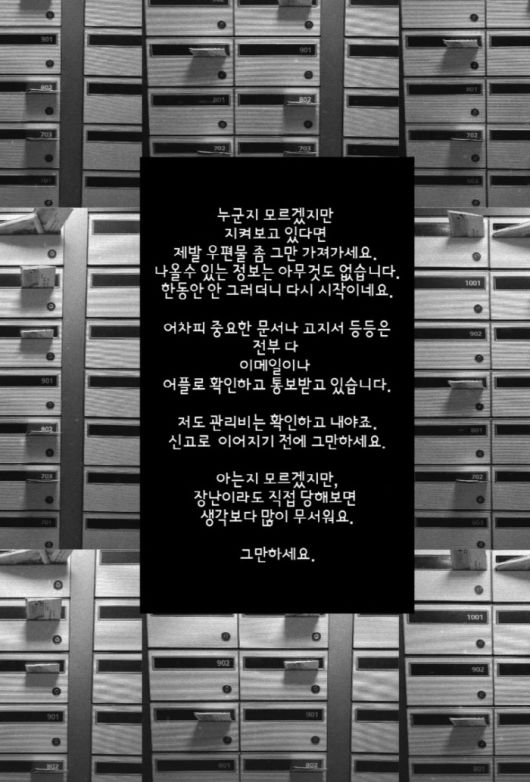 이어 "어차피 중요한 문서나 고지서 등등은 전부 다 이메일이나 어플로 확인하고 통보받고 있습니다. 저도 관리비는 확인하고 내야죠. 신고로 이어지기 전에 그만하세요"라며 "아는지 모르겠지만 장난이라도 직접 당해보면 생각보다 많이 무서워요. 그만하세요"라고 도난범에 경고했다.