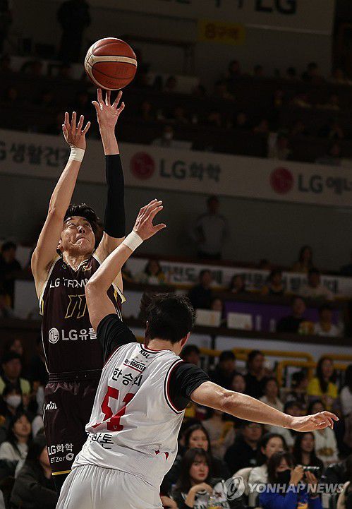 (창원=연합뉴스) 김동민 기자 = 25일 경남 창원체육관에서 열린 2025-2026 LG전자 프로농구 정규리그 창원 LG 세이커스와 안양 정관장 레드부스터스의 경기. LG 허일영이 슛하고 있다. 2026.1.25
