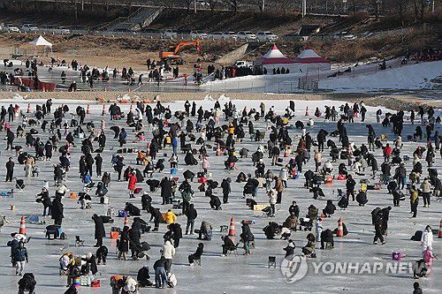 냉기가 고스란히 전해지는 얼음벌판 위에서 두꺼운 방한복과 장갑으로 중무장한 방문객들은 낚싯대를 드리우며 입질을 기다렸다.