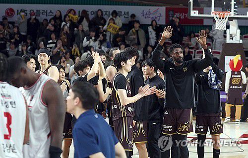 (창원=연합뉴스) 김동민 기자 = 25일 경남 창원체육관에서 열린 2025-2026 LG전자 프로농구 정규리그 창원 LG 세이커스와 안양 정관장 레드부스터스의 경기. 정관장에 76대 53으로 승리한 LG 선수단이 기뻐하고 있다. 2026.1.25