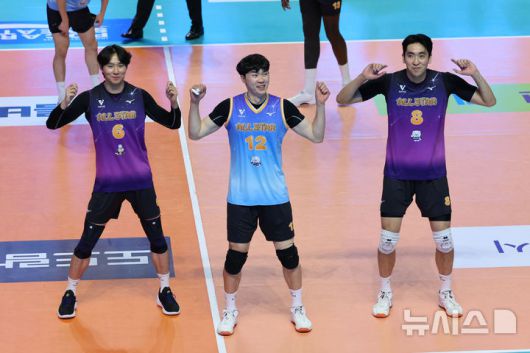 [춘천=뉴시스] 권창회 기자 = 25일 강원 춘천시 호반체육관에서 열린 진에어 2025~2026 V-리그 올스타전에서 K-스타 전광인이 춤을 추고 있다. 2026.01.25. kch0523@newsis.com