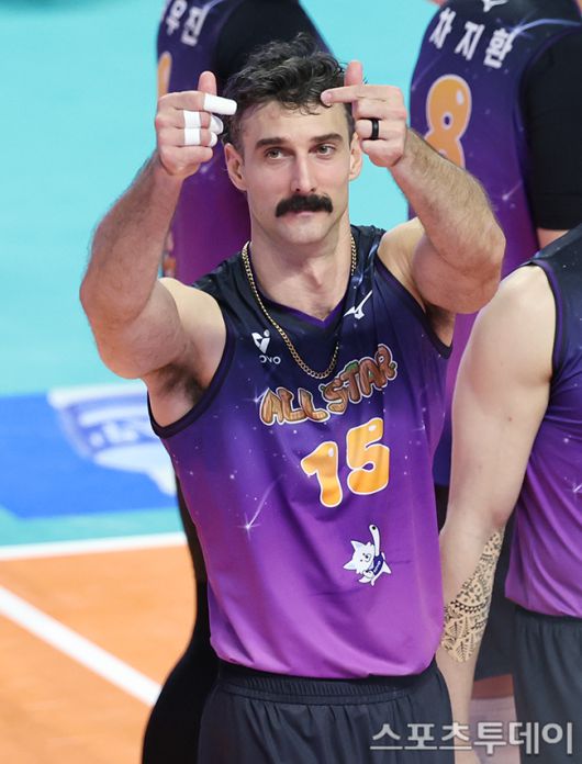 [춘천(강원)=스포츠투데이 권광일 기자] 2025-2026 진에어 V-리그 올스타전 K스타와 V스타의 경기가 25일 강원 춘천시 호반체육관에서 열렸다. V스타 러셀이 올스타전에서 득점 성공에 세레머니를 하고 있다. 2026.01.25. [스포츠투데이 권광일 기자 sports@stoo.com]
