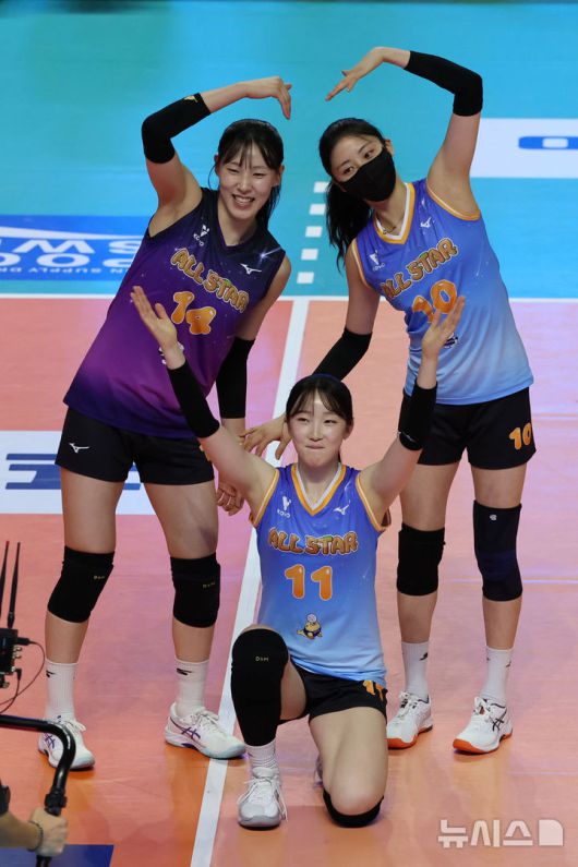 [춘천=뉴시스] 권창회 기자 = 25일 강원 춘천시 호반체육관에서 열린 진에어 2025~2026 V-리그 올스타전에서 K-스타 최서현과 이선우, 박혜민이 춤을 추고 있다. 2026.01.25. kch0523@newsis.com