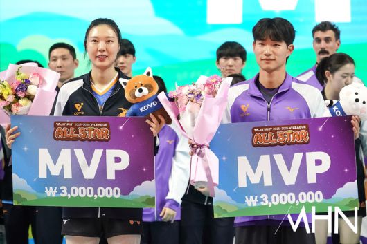 이어 MVP에는 김우진(17표/삼성화재), 양효진(19표/현대건설)이 선정됐다. 두 사람 모두 이번이 첫 MVP 선정이다. MVP에 선정된 남녀부 각 선수는 상금 300만원과 인형, 왕복 항공권을 받는다.