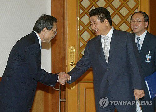 사진은 이 전 총리가 2004년 7월 27일 청와대에서 열린 국무회의에서 노무현 대통령과 악수하는 모습. 2026.1.25 [연합뉴스 자료사진]