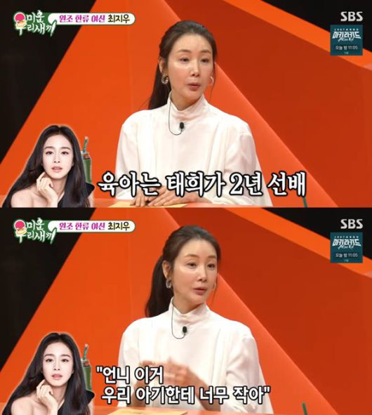이어 46세에 첫 아이를 출산한 것에 대해 언급되자, 최지우는" 육아와 관련해 김태희에게 조언을 많이 구한다"며 "아이 학원도 함께 알아보고, 발레 학원도 같이 보낸다. 김태희가 2년 선배 엄마라 많이 물어본다"고 덧붙였다.