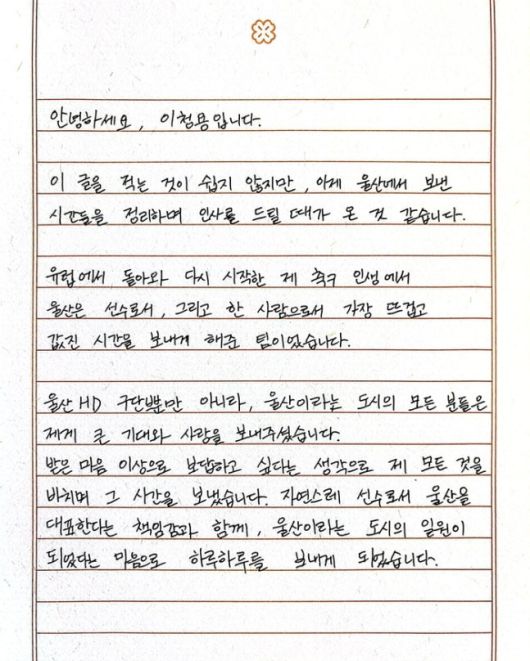 지난 시즌을 끝으로 울산과의 계약이 만료돼 자유계약(FA) 신분이 됐으나 울산과의 동행을 끝내기로 결정한 이청용은 자필 편지로 울산 팬들에게 마지막 인사를 전했다.