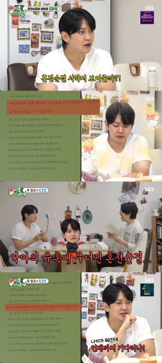 [OSEN=박근희 기자] '미운 우리 새끼’ 가수 강균성이 자신의 집을 방문한 김희철 앞에서 혼전순결 서약에 대한 반전 결과를 공개했다.