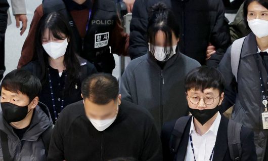 캄보디아에서 연애를 빙자한 사기 일명 '로맨스스캠'으로 120억원을 가로챈 한국인 총책 부부가 지난 23일 인천국제공항 제2터미널을 통해 한국 국적 캄보디아 스캠조직 피의자들과 강제 송환되고 있다. 초국가범죄 특별대응 TF는 캄보디아를 거점으로 우리 국민 869명에게 약 486억원을 편취한 한국 국적 피의자 73명을 강제 송환했다. 뉴시스 |