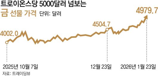23일(현지 시간) 미 뉴욕상품거래소에서 금 선물 가격은 전 거래일 대비 1.35% 오른 트로이온스당 4979.70달러에 장을 마쳤다. 2024년 2월 14일 2000달러에 못 미쳤던 금 가격을 고려하면 약 2년 사이에 2.5배로 오른 것이다.