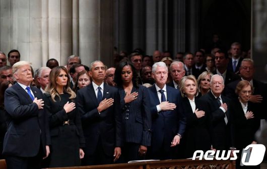 도널드 트럼프 미국 대통령과 부인 멜라니아 여사와 버락 오바마, 빌 클린턴, 지미 카터 등 전직 대통령 부부들이 5일 (현지시간) 워싱턴 국립성당에서 거행된 조지 H.W. 부시 전 미국 대통령의 국장에 참석해 손을 가슴에 얹고 조의를 표하고 있다. 2018.12.5 ⓒ AFP=뉴스1 |