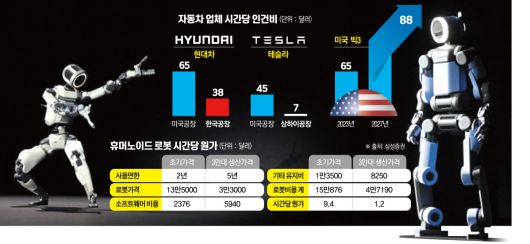 기업 전략 측면에서 로봇은 단순 설비를 넘어 기업 경쟁력으로 직결되고 있다. 증권가에 따르면 미국 제조업 평균 인건비는 연간 7만~8만 달러 수준이다. 반면 휴머노이드 로봇 ‘아틀라스’는 배터리 교환 방식으로 사실상 24시간 가동할 수 있다. 초기에는 시간당 원가가 9.4달러에 달하지만, 생산 대수가 3만 대를 넘으면 1.2달러까지 떨어진다. 이는 중국 제조업 인건비의 약 6분의 1 수준으로 추정된다.