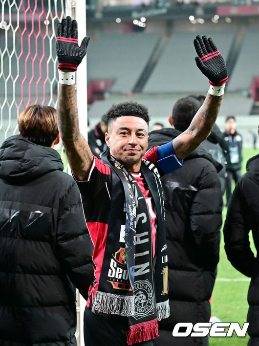 [OSEN=서월월드컵경기장, 박준형 기자] 제시 린가드(33, 서울)의 라스트 댄스는 무승부로 끝났다.FC서울은 10일 오후 서울월드컵경기장에서 2025~2026시즌 아시아축구연맹(AFC) 챔피언스리그 엘리트(ACLE) 리그 스테이지에서 린가드의 선제골이 터졌지만 지키지 못하고 멜버른 시티와 1-1로 비겼다.서울(2승3무1패, 승점 9)은 5위로 밀렸다. 멜버른 스티(3승1무2패, 승점 10점)는 4위다.경기종료 후 FC서울 린가드 고별행사에서 린가드가 팬들에게 인사를 하고 있다. 2025.12.10 / soul1014@osen.co.kr |