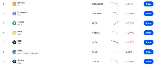 한국시간 26일 오전 6시 50분 기준 글로벌 거래소 코인 베이스에 따르면 비트코인은 8만6500.45달러로 전일 대비 3.14% 하락했다. 시가총액 2위 이더리움은 2810.69달러로 4.99% 떨어졌다.
