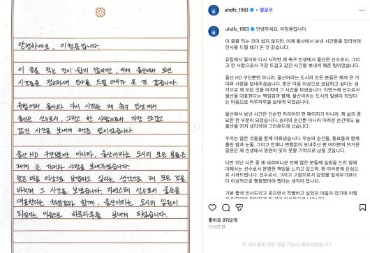 "이성적으로 행동했어야 했다"는 말로 사실상 이를 인정한 이청용은 "울산에서 보낸 시간은 단순한 커리어의 한 페이지가 아니라, 제 삶의 중요한 한 부분이 되었다. 승리의 순간뿐 아니라 어려운 순간에도 늘 울산을 먼저 생각하며 그라운드에 섰다"는 소회를 밝혔습니다.