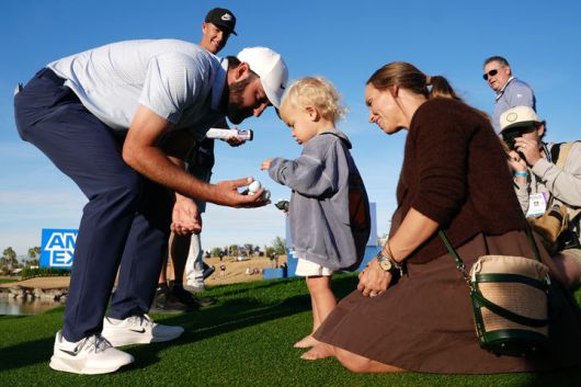 [라킨타=AP/뉴시스] 스코티 셰플러가 25일(현지 시간) 미 캘리포니아주 라킨타의 피트 다이 스타디움에서 열린 미국프로골프(PGA) 투어 아메리칸 익스프레스에서 우승한 후 아들 베넷에게 공을 건네고 있다. 세계 1위 셰플러는 최종 합계 27언더파 261타로 우승하며 PGA 통산 20승을 달성했다. 2026.01.26.