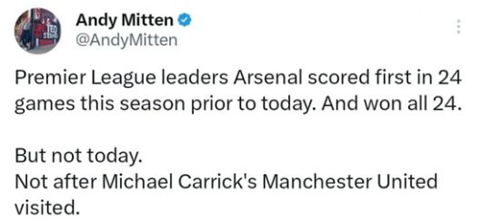 영국 축구 전문가 앤디 미튼은 26일(한국시간) 자신의 SNS를 통해 아스널의 놀라운 기록이 중단되었음을 조명했다.