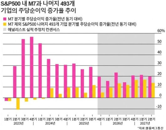빅테크들의 AI 설비투자액은 계속 늘어날 것으로 예상되는 한편 이익 증가세는 감속이 예상된다. 블룸버그통신이 집계한 애널리스트 컨센서스에 따르면 이른바 M7 업체들의 작년 4분기 주당순이익 증가율은 20%로 2023년 초 이후 최저 수준으로 추정되고 있다.