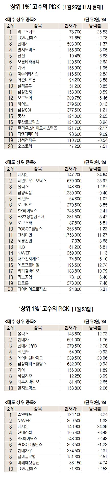 미래에셋증권은 자사 고객 중에서 지난 1개월간 수익률 상위 1% 투자자들의 매매 종목을 집계해 실시간·전일·최근 5일 기준으로 모바일트레이딩시스템(MTS) 상에서 공개하고 있다. 이 통계 데이터는 미래에셋증권의 의견과 무관한 단순 정보 안내이며 각각의 투자자 개인에게 맞는 투자 또는 수익 달성을 보장하지 않는다. 또 테마주 관련종목은 이상 급등락 가능성이 있으므로 유의해야 한다.