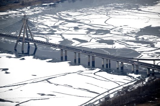 26일 오전 서울 송파구 롯데월드타워 전망대에서 바라본 올림픽대교 인근 한강이 얼어 수면 위에 눈이 쌓여 있다. 기상청에 따르면 북쪽에서 내려오는 찬 공기의 영향으로 당분간 중부지방과 경북·전북 내륙은 아침 기온이 -10도 안팎, 낮 기온도 0도 이하의 ‘냉동고’ 추위가 이어지겠다. 이번 추위는 이번 주 내내 이어지다가 토요일인 31일 차차 누그러져 평년 기온을 회복할 것으로 전망된다. 임세준 기자
