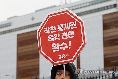 (서울=연합뉴스) 이지은 기자 = 안규백 국방부 장관과 엘브리지 콜비 미국 국방부(전쟁부) 정책담당 차관이 면담을 한 가운데 26일 서울 용산구 국방부 앞에서 평화와통일을여는사람들 회원이 규탄 기자회견을 열고 구호를 외치고 있다. 2026.1.26