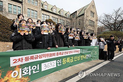 (서울=연합뉴스) 임화영 기자 = 이화여자대학교 학생들이 26일 서울 서대문구 이화여대 본관 앞에서 '등록금 인상 반대 기자회견'을 하고 있다. 2026.1.26