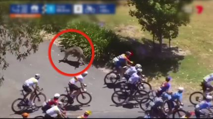 주행 중에 그만 넘어지면서 도로 한복판에 주저앉은 선수도 보이는데요, 순조롭게 막바지에 접어든 경기를 난장판으로 만든 범인, 바로 도로에 난입한 캥거루였습니다.
