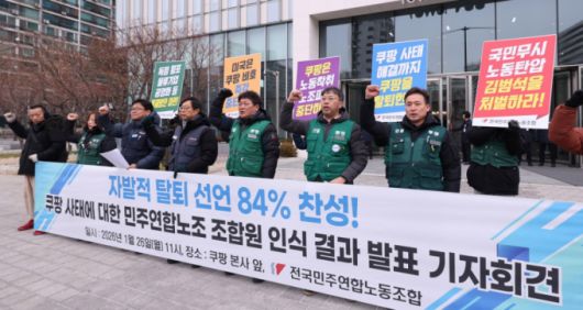 민주연합노조는 "노조가 제안한 '자발적 쿠팡 탈퇴 선언'에 동의한다고 응답한 조합원이 84%에 달했다"고 했다. 조합원 1200여명을 대상으로 지난 8일부터 14일까지 설문조사를 실시한 결과다. 민주연합노조는 공공 및 민간 부문 비정규직 노동자로 구성돼있다.