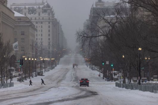 25일(현지시각) 미국 워싱턴에서 차량과 보행자들이 눈 속을 지나 이동하고 있다. 워싱턴/AFP 연합뉴스 |
