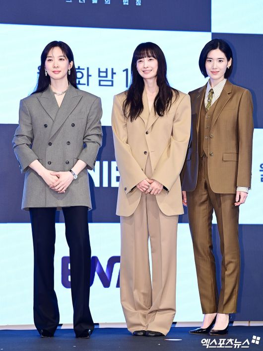(엑스포츠뉴스 박지영 기자) 26일 오후 서울 신도림동 더 세인트에서 ENA 월화드라마 '아너: 그녀들의 법정' 제작발표회가 열렸다. 이날 제작발표회에 참석한 배우 이청아, 이나영, 정은채가 포토타임을 갖고 있다.박지영 기자 jypark@xportsnews.com