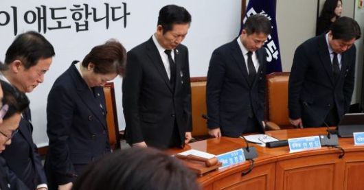 정청래 대표와 한병도 원내대표를 비롯한 더불어민주당 지도부가 26일 국회에서 열린 최고위원회의에서 이해찬 전 국무총리의 별세를 애도하며 묵념하고 있다. <ⓒ투자가를 위한 경제콘텐츠 플랫폼, 아시아경제(www.asiae.co.kr) 무단전재 배포금지>