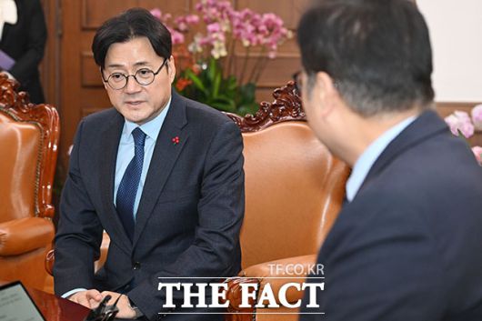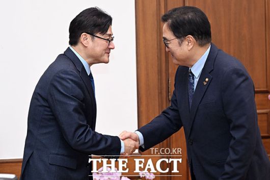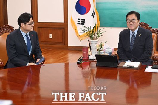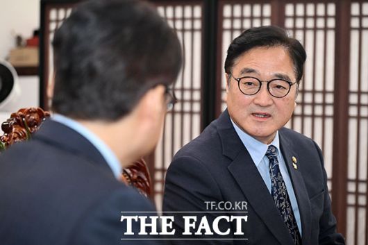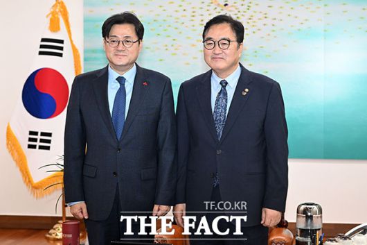 [더팩트ㅣ국회=남용희 기자] 우원식 국회의장(오른쪽)이 26일 오후 서울 여의도 국회 의장집무실에서 홍익표 청와대 정무수석을 접견하며 기념촬영을 하고 있다.
