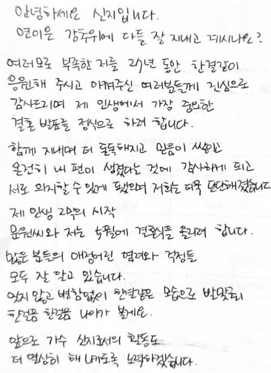 진심이 담긴 글에 공개 직후부터 수많은 축하 댓글이 달리며 뜨거운 반응을 얻고 있다.