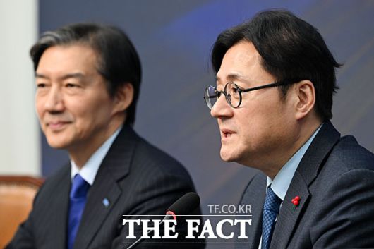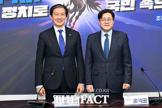 조국 조국혁신당 대표(왼쪽)가 26일 오후 서울 여의도 국회에서 홍익표 청와대 정무수석을 접견하며 기념촬영을 하고 있다. /국회=남용희 기자 |