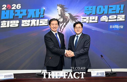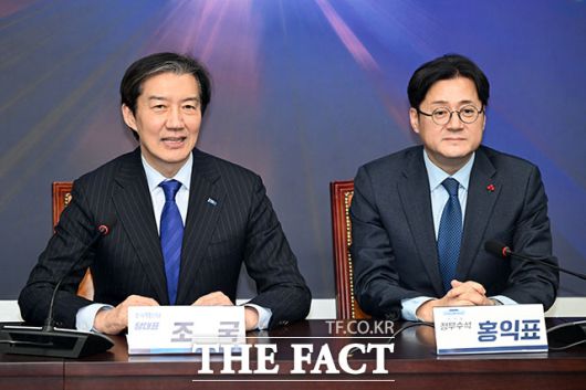 [더팩트ㅣ국회=남용희 기자] 조국 조국혁신당 대표(왼쪽)가 26일 오후 서울 여의도 국회에서 홍익표 청와대 정무수석을 접견하며 기념촬영을 하고 있다.