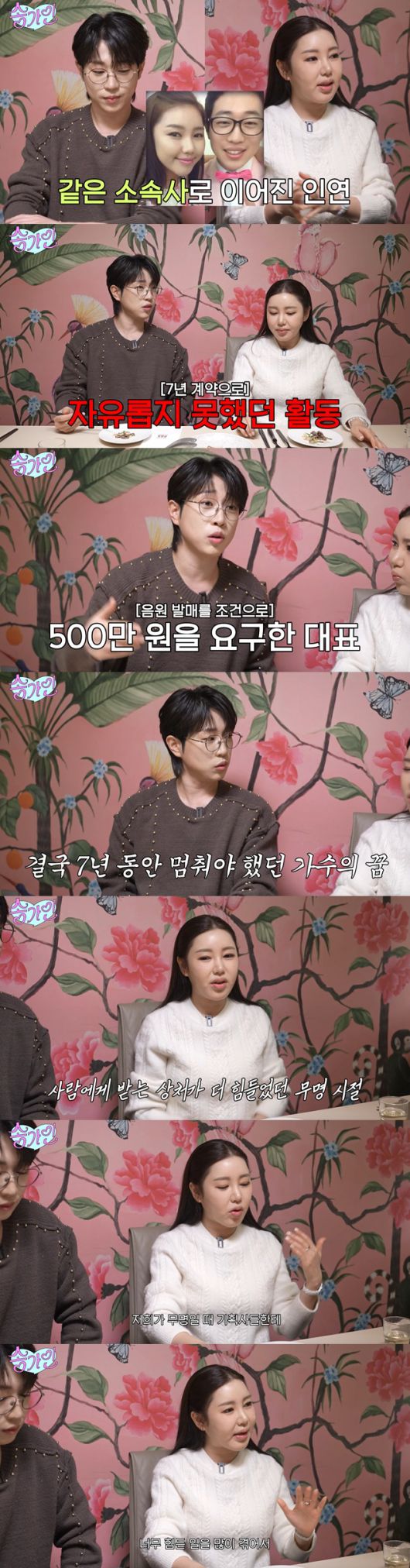 안성훈은 이어 "아버지가 소속사 대표님을 만나 '회사가 너무 어려운데 놔줄 거냐'고 물으니 대표가 '500만 원 주면 노래를 내주겠다'고 했다. 결국 저는 쉽게 풀리지 않아 소송까지 갔다. 내용 증명을 보내고 서로 다투다가 '노래 안 하면 놔주겠다'고 해 7년간 노래를 하지 못했다"고 털어놨다.