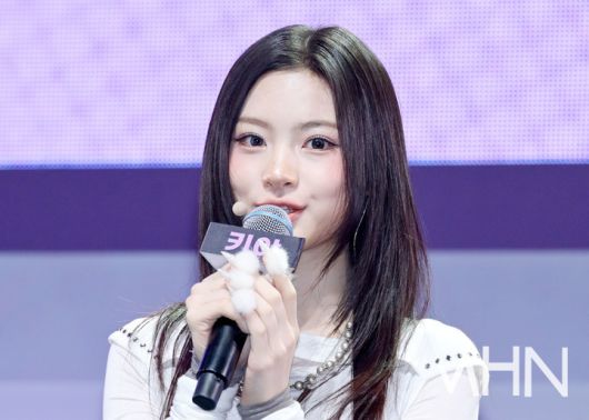 (MHN 이지숙 기자) 그룹 키키(KiiiKiii) 키야가 26일 오후 서울 광진구 예스24라이브홀에서 열린 미니 2집 '델룰루 팩(Delulu Pack)' 발매 기념 쇼케이스에서 질의응답 시간을 가지고 있다.