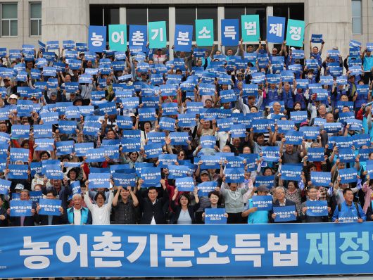 지난해 9월 12일 서울 여의도 국회 본청 앞 계단에서 열린 농어촌기본소득법 제정 촉구 기자회견에서 참가자들이 구호를 외치고 있다. [연합] |