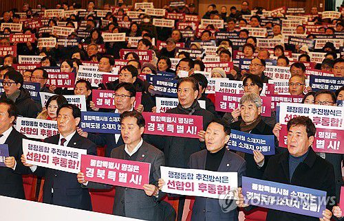 (안동=연합뉴스) 김현태 기자 = 26일 오후 경북 안동시민회관에서 열린 '경북·대구 행정통합 주민설명회'에서 참석자들이 통합에 앞선 조건을 촉구하는 퍼포먼스를 하고 있다. 2026.1.26