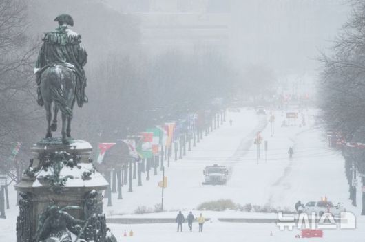 [AP/뉴시스] 25일 눈이 많이 내린 미 동부 필라델피아 프랭클린 파크웨서 눈을 치우고 있다. 왼쪽은 조지 워싱턴 동상 |
