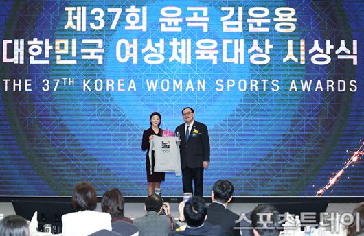 [스포츠투데이 권광일 기자] LPBA 김가영이 26일 오후 서울 송파구 방이동 서울올림픽파크텔에서 열린 제37회 윤곡 김운용 대한민국 여성체육대상 시상식에 참석해 하형주 체육진흥공단 이사장과 기념촬영을 하고 있다. 2026.01.26. [스포츠투데이 권광일 기자 sports@stoo.com]