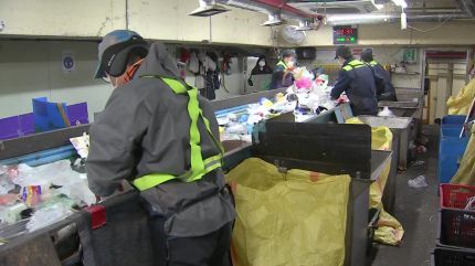 컨베이어 벨트 위, 재활용품을 분류하는 손길이 분주합니다.