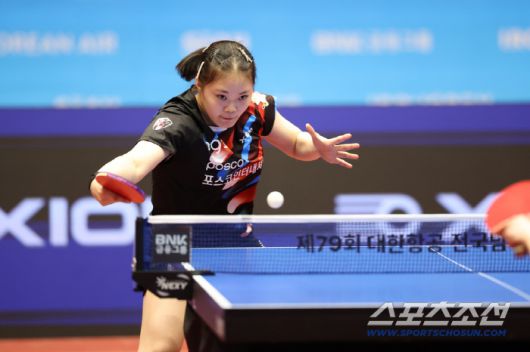제1단식은 양팀 에이스 대결이었다. '대한민국 톱랭커' 신유빈이 '포스코 에이스' 김나영을 게임스코어 3대0으로 돌려세웠다.