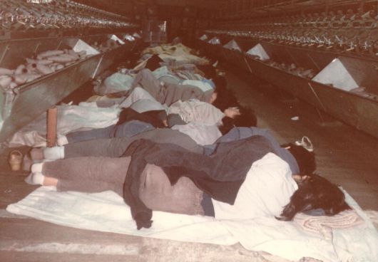 섬유·직물 공장 원풍모방의 여성 조합원들이 1982년 9월27일부터 10월1일까지 진행된 공권력의 노조 파괴에 맞서 작업장 기계들 사이에서 새우잠을 자며 농성장을 지키고 있다. 필자 제공 |