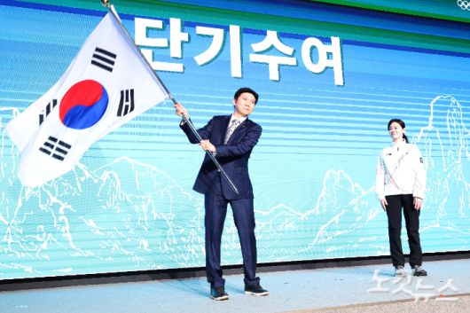 유승민 대한체육회장이 지난 22일 서울 송파구 올림픽파크텔에서 열린 2026 밀라노코르티나 동계올림픽대회 결단식에서 이수경 선수단장에게 수여할 단기를 흔들고 있다. 박종민 기자 |