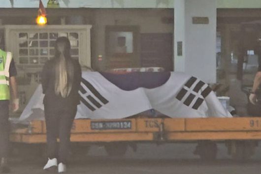 운구 행렬이 공항에 도착하자 유족은 화물칸에 실리는 고인의 관에 인사하고 손수 대형 태극기로 관을 감쌌다. 태극기로 감싼 관은 한국까지 그대로 이동하게 된다.