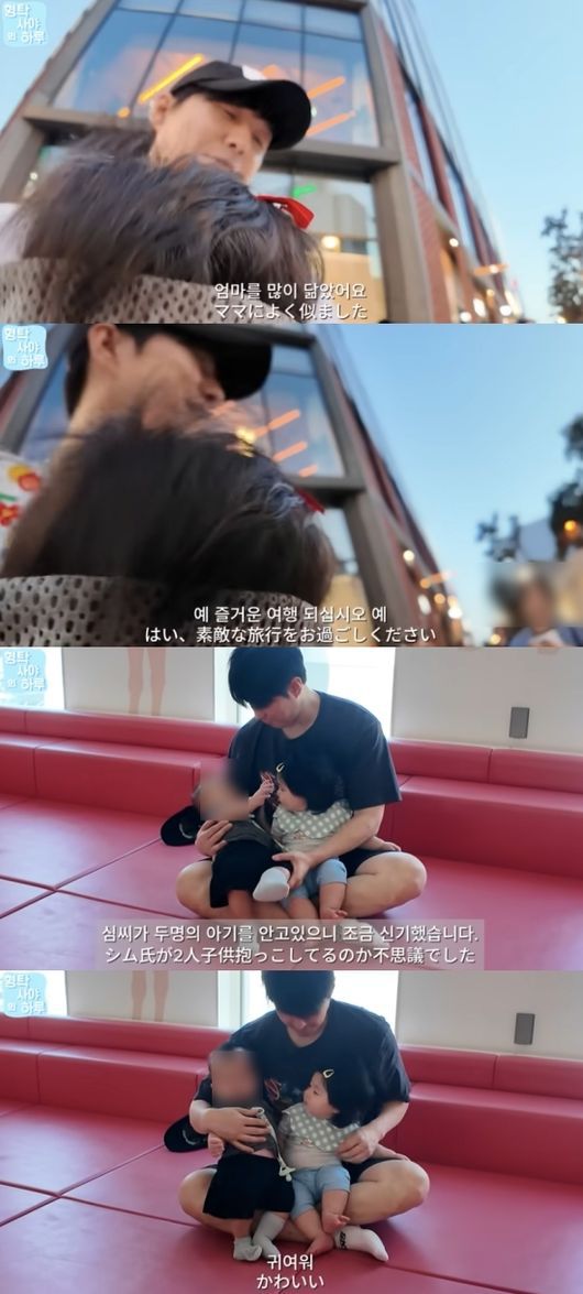 여행을 마친 심형탁 가족은 공항 가는 길, 휴식 공간에 들렀고, 심형탁은 지인의 아기까지 두 명의 아기를 한 번에 안고 행복한 표정을 지었다.