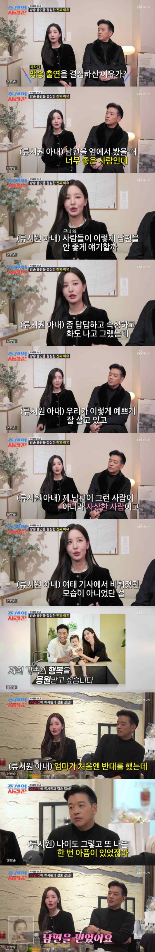 26일 방송된 TV CHOSUN 극사실주의 다큐 예능 '조선의 사랑꾼'에서는 류시원 부부가 출연해 윤정수, 원진서 부부와 함께 근황을 나누는 모습이 전파를 탔다. 이날 류시원과 이아영은 결혼 6년 만에 공개 석상에 모습을 드러낸 이유를 솔직하게 밝혔다.