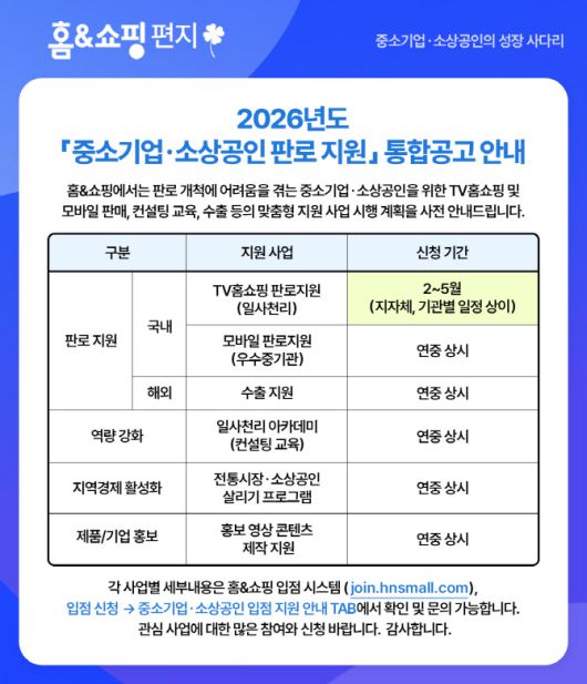 홈앤쇼핑은 ‘2026년도 중소기업·소상공인 판로지원 통합 공고’를 사전 안내하고 TV홈쇼핑과 모바일, 해외 수출까지 연계한 맞춤형 지원에 나선다고 26일 밝혔다.