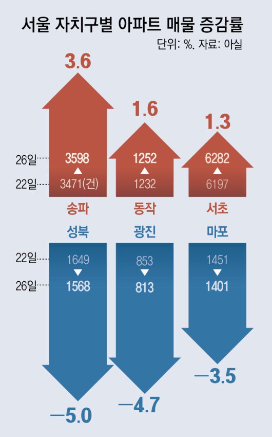 26일 부동산 플랫폼 아실에 따르면 이날 기준 서울 25개 구 중 8개 구에서 이 대통령의 발언이 나오기 전날인 22일보다 매물이 늘어났다. 서울 송파구에서 3.6% 늘어났고 동작(1.6%), 서초(1.3%), 성동(1.1%), 강동구(1%) 순으로 나타났다.